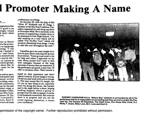 Meanwhile, the Cleveland hip hop scene was spreading in other expressions. A 1991 article in the Call & Post stated that the elite graffiti crew, D.E.F (Doin’ Everything Funky), had been active for several years, and included graffiti artists such as mr. soul (from Lee-Harvard) and sano (Callings). Another 1984 article described that Ranger, from Garfield Heights, had tags all throughout the city at age 17 (Pieters). Evidently, most of these artists were kids.